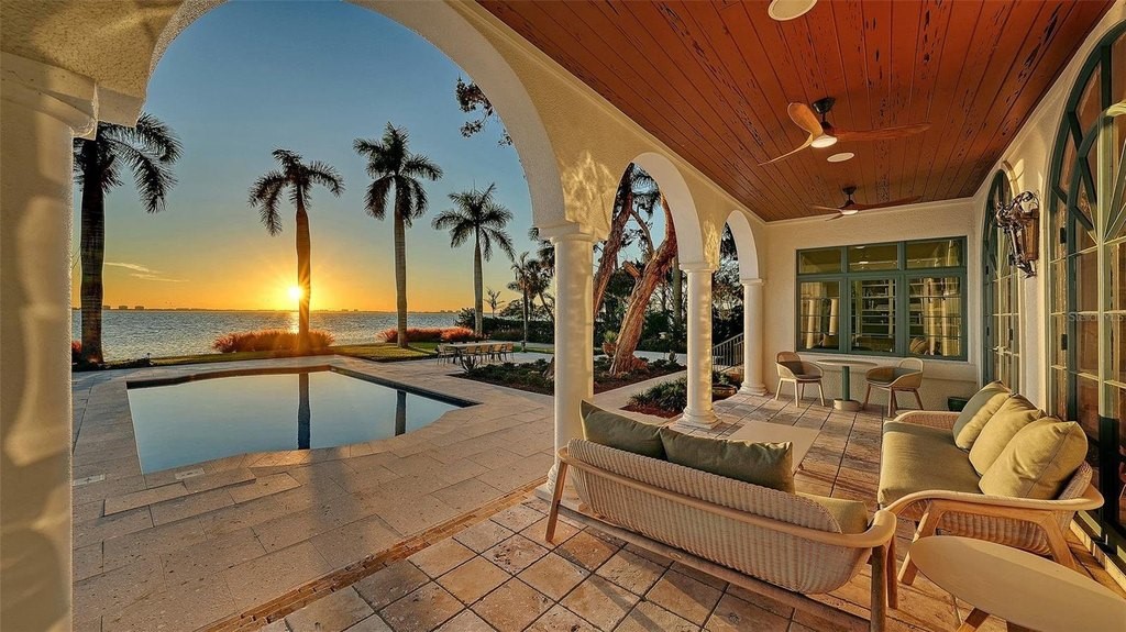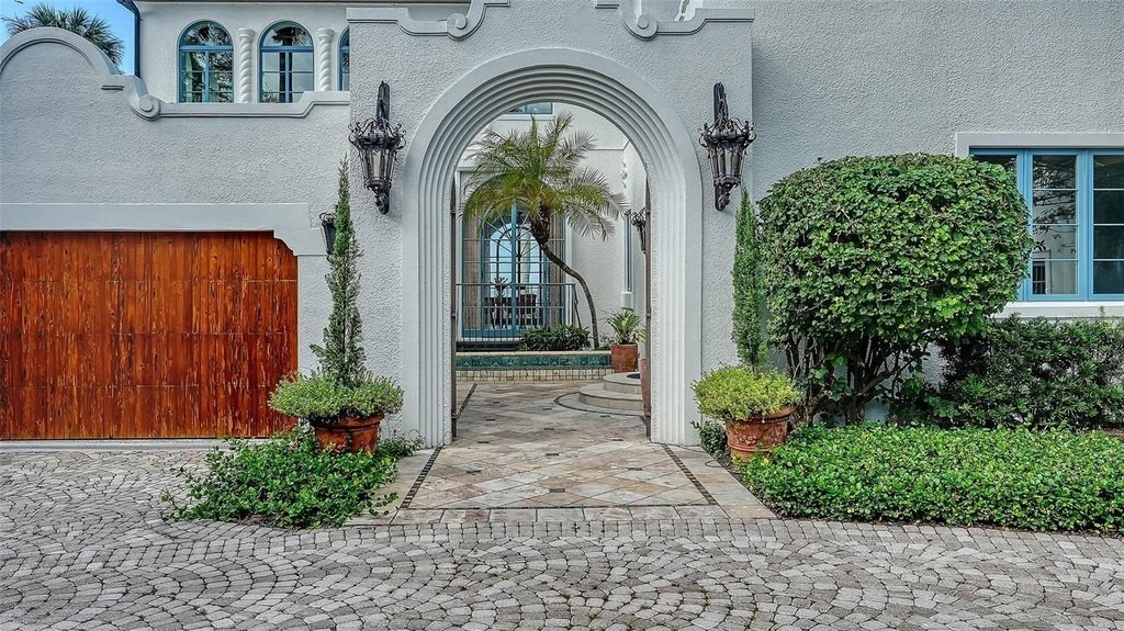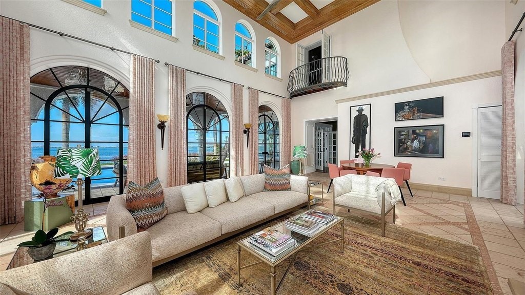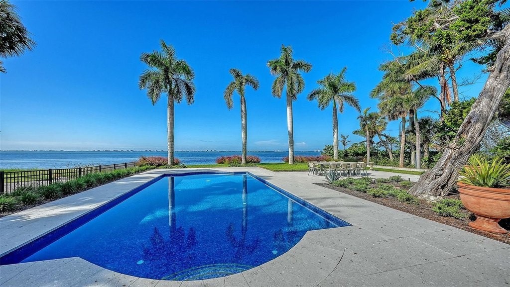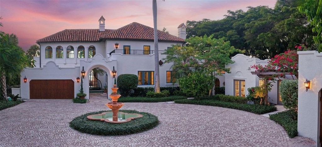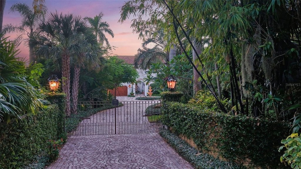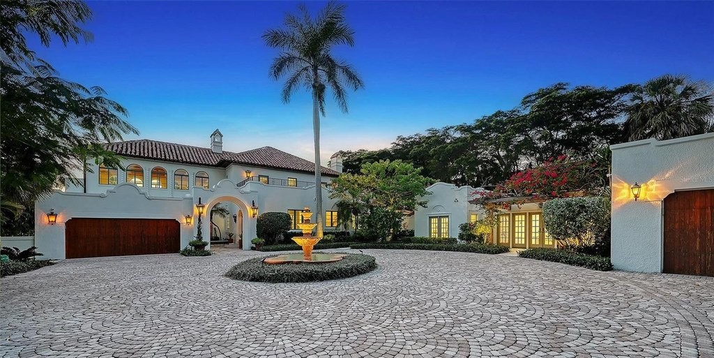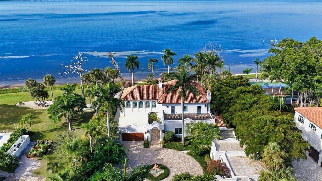 STUNNING BAYFRONT ESTATE at an incredible price. Located in the Indian Beach–Sapphire Shores neighborhood, this 1925 Mediterranean estate sits on nearly three-quarters of an acre with sweeping views of Sarasota Bay—from the downtown skyline and Ringling Bridge to the northern tip of Longboat Key. Meticulously updated while maintaining its original character, the home blends historic craftsmanship with modern comfort. Behind the gated entry, a koi pond and circular drive with a central fountain lead to a welcoming courtyard featuring four garage spaces. The main living areas are defined by high ceilings, detailed millwork, and generous natural light. The formal living room features a coffered ceiling and marble fireplace, while the adjoining dining room offers bay views, custom built-ins, and a hand-painted recessed ceiling. The newly renovated kitchen includes a Sub-Zero refrigerator, AGA induction range, dolomite countertops, and breakfast area. The den/office overlooks the pool and bay, and the grand salon—with its soaring ceilings, stately fireplace, and 10-foot arched doors—opens to a large covered terrace ideal for entertaining or enjoying the spectacular sunsets. Upstairs are three ensuite bedrooms, each with access to a private terrace. The primary suite, fully redesigned in 2021, includes a spacious walk-in closet, and a luxurious bath with soaking tub, and walk-in shower. Landscape architect Michael Gilkey transformed the grounds into multiple outdoor spaces featuring a lush tropical garden, bocce court, tiled heated pool, and ample patio space. A separate guesthouse offers two rooms, 2 baths, and a kitchenette, easily configured as two ensuite bedrooms. Additional updates include new HVAC systems, air-conditioned garages, new seawall (2022), upgraded electrical and lighting, and impact-rated windows and doors. A rare blend of history, privacy, and waterfront elegance. Book your private showing today.