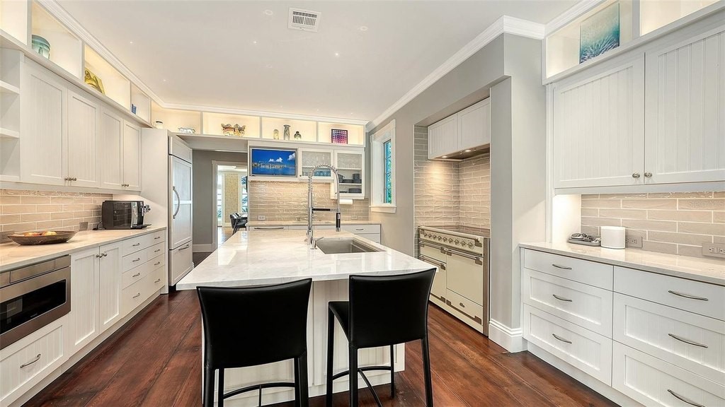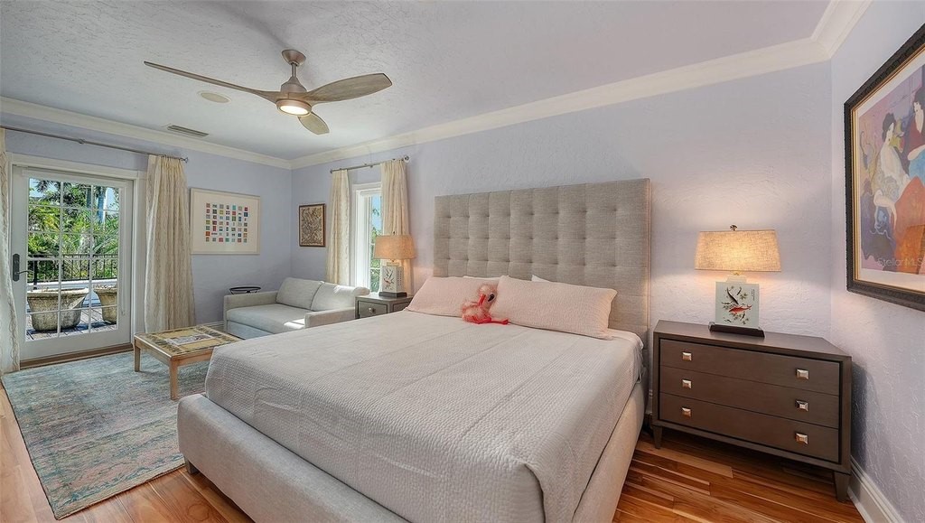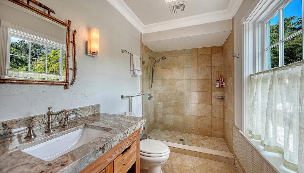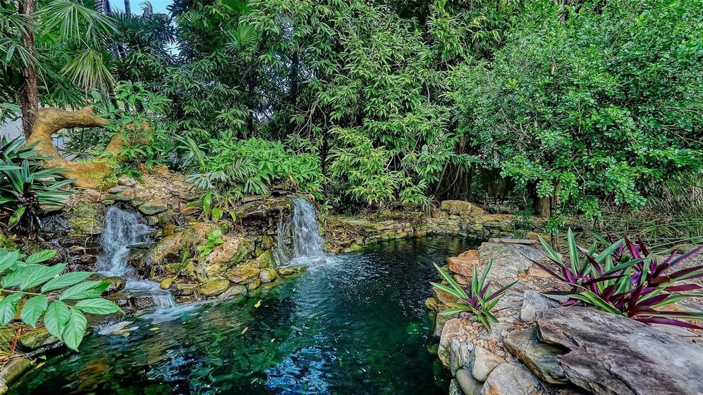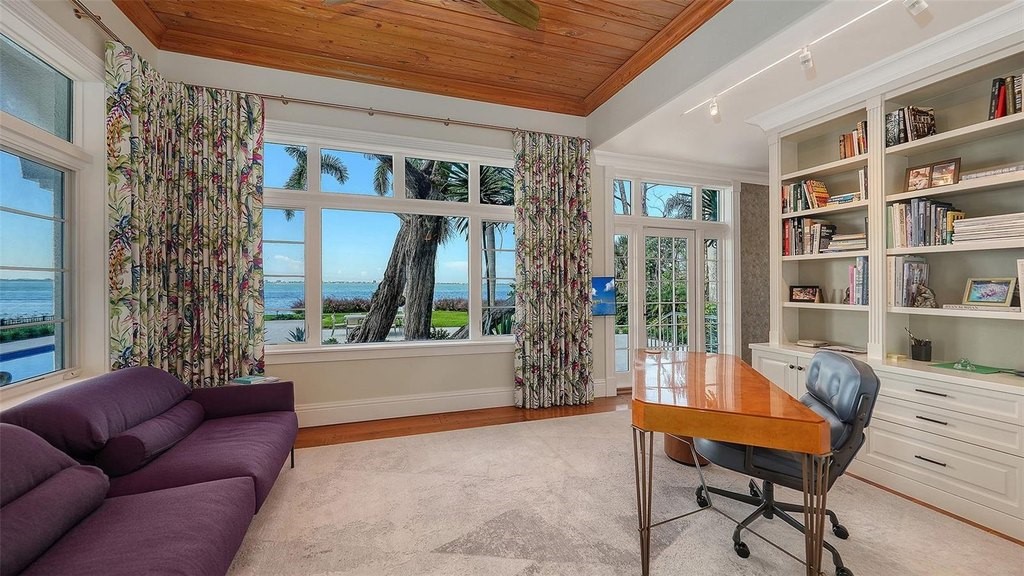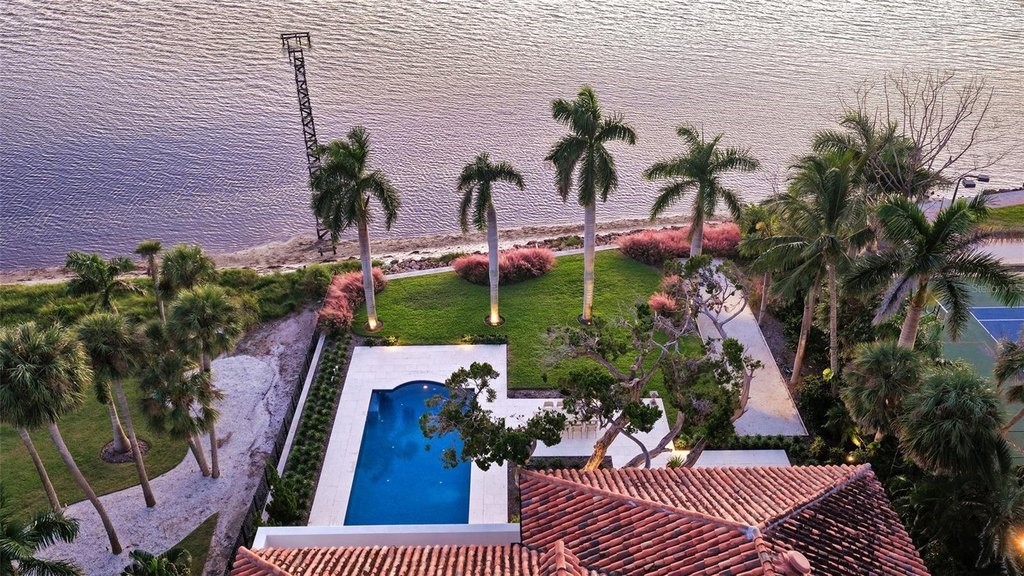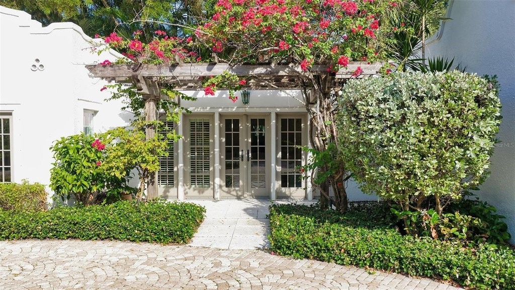 STUNNING BAYFRONT ESTATE at an incredible price. Located in the Indian Beach–Sapphire Shores neighborhood, this 1925 Mediterranean estate sits on nearly three-quarters of an acre with sweeping views of Sarasota Bay—from the downtown skyline and Ringling Bridge to the northern tip of Longboat Key. Meticulously updated while maintaining its original character, the home blends historic craftsmanship with modern comfort. Behind the gated entry, a koi pond and circular drive with a central fountain lead to a welcoming courtyard featuring four garage spaces. The main living areas are defined by high ceilings, detailed millwork, and generous natural light. The formal living room features a coffered ceiling and marble fireplace, while the adjoining dining room offers bay views, custom built-ins, and a hand-painted recessed ceiling. The newly renovated kitchen includes a Sub-Zero refrigerator, AGA induction range, dolomite countertops, and breakfast area. The den/office overlooks the pool and bay, and the grand salon—with its soaring ceilings, stately fireplace, and 10-foot arched doors—opens to a large covered terrace ideal for entertaining or enjoying the spectacular sunsets. Upstairs are three ensuite bedrooms, each with access to a private terrace. The primary suite, fully redesigned in 2021, includes a spacious walk-in closet, and a luxurious bath with soaking tub, and walk-in shower. Landscape architect Michael Gilkey transformed the grounds into multiple outdoor spaces featuring a lush tropical garden, bocce court, tiled heated pool, and ample patio space. A separate guesthouse offers two rooms, 2 baths, and a kitchenette, easily configured as two ensuite bedrooms. Additional updates include new HVAC systems, air-conditioned garages, new seawall (2022), upgraded electrical and lighting, and impact-rated windows and doors. A rare blend of history, privacy, and waterfront elegance. Book your private showing today.